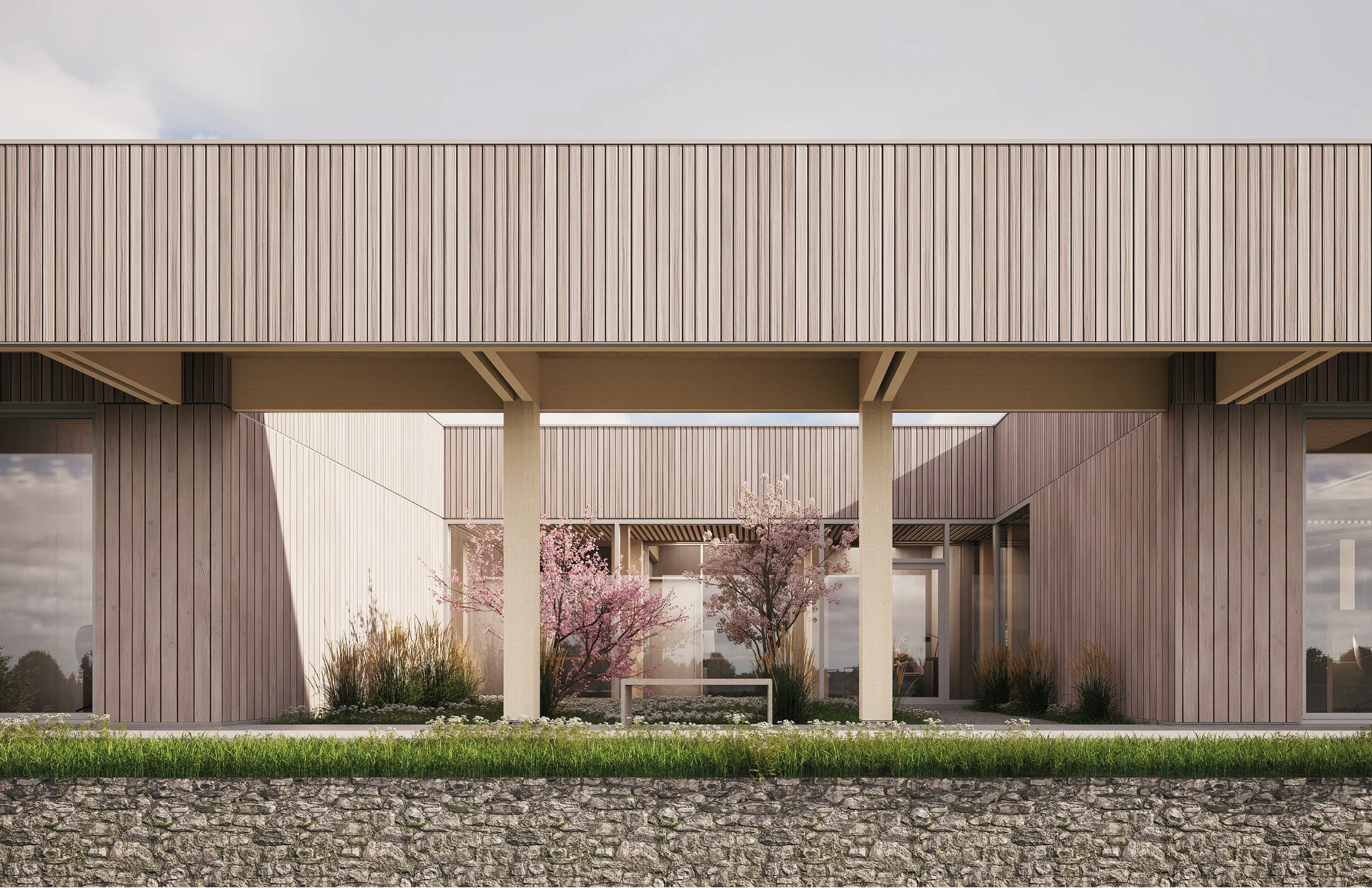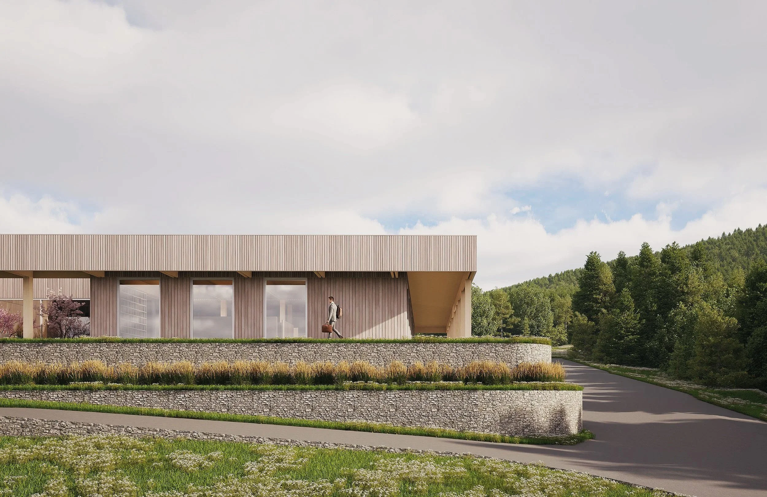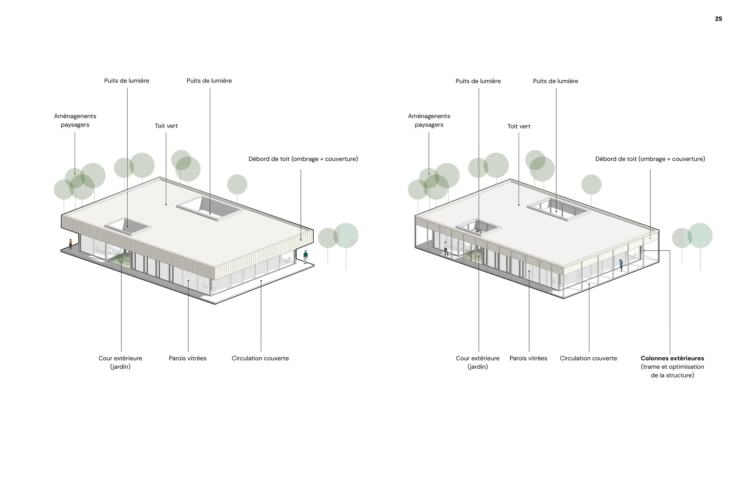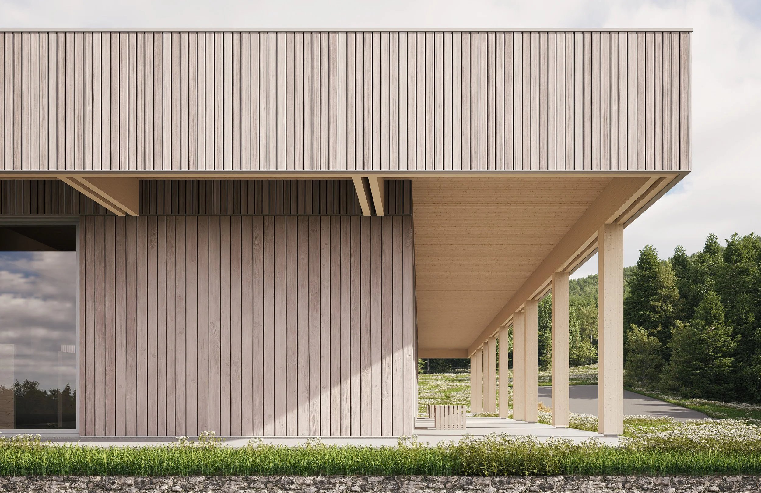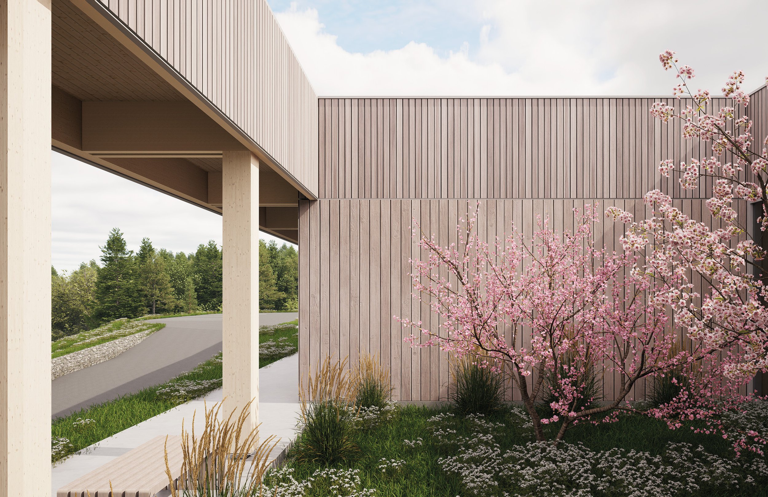 Les espaces extérieurs deviennent le prolongement naturel des espaces intérieurs, soutenus par des principes bioclimatiques comme les débords de toiture, l’orientation des ouvertures et le contrôle de l’ensoleillement, visant un confort durable et une réduction des besoins énergétiques. Le projet propose ainsi un modèle de bâtiment commercial reproductible valorisant les produits du bois et les matériaux biosourcés québécois.