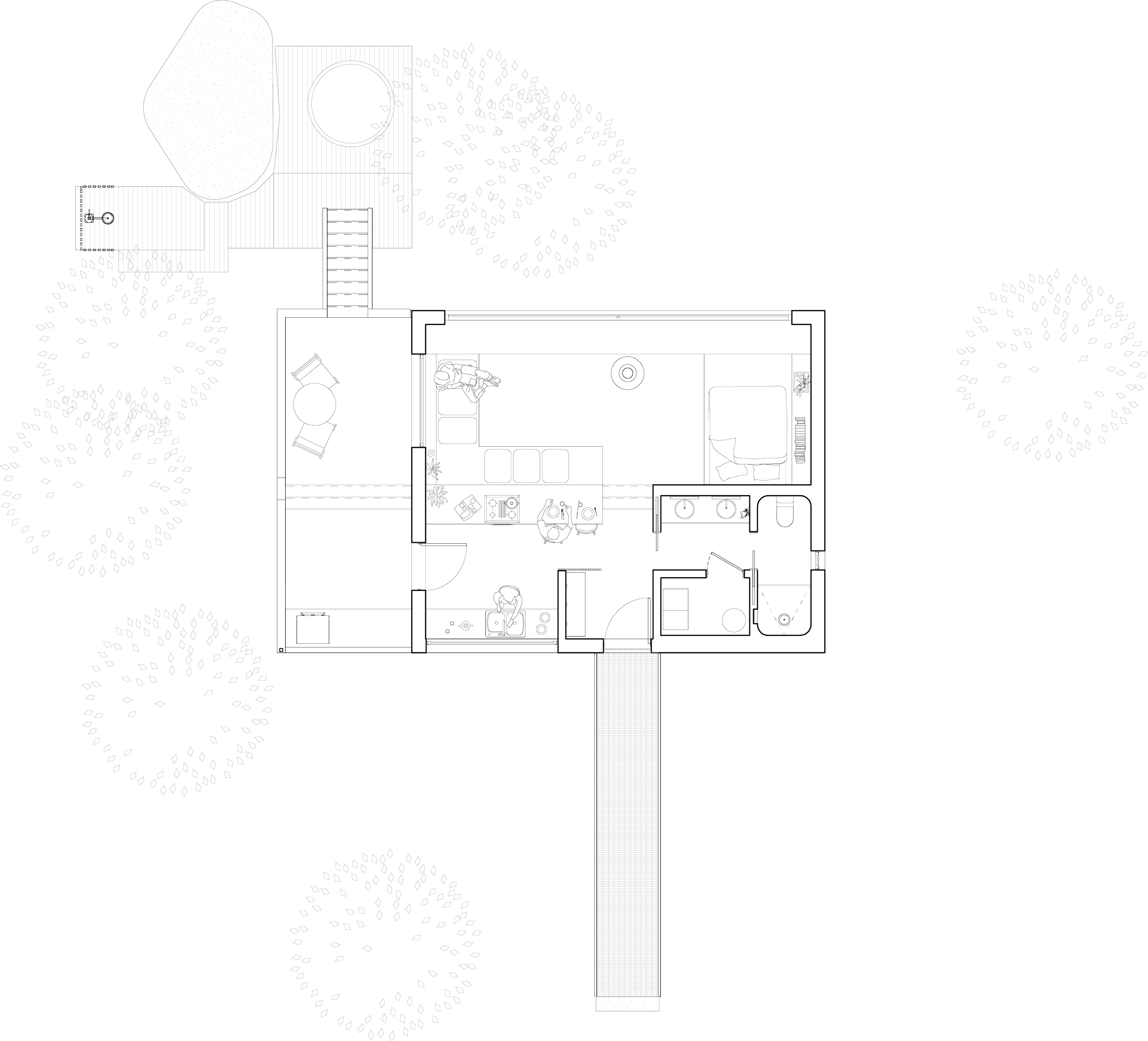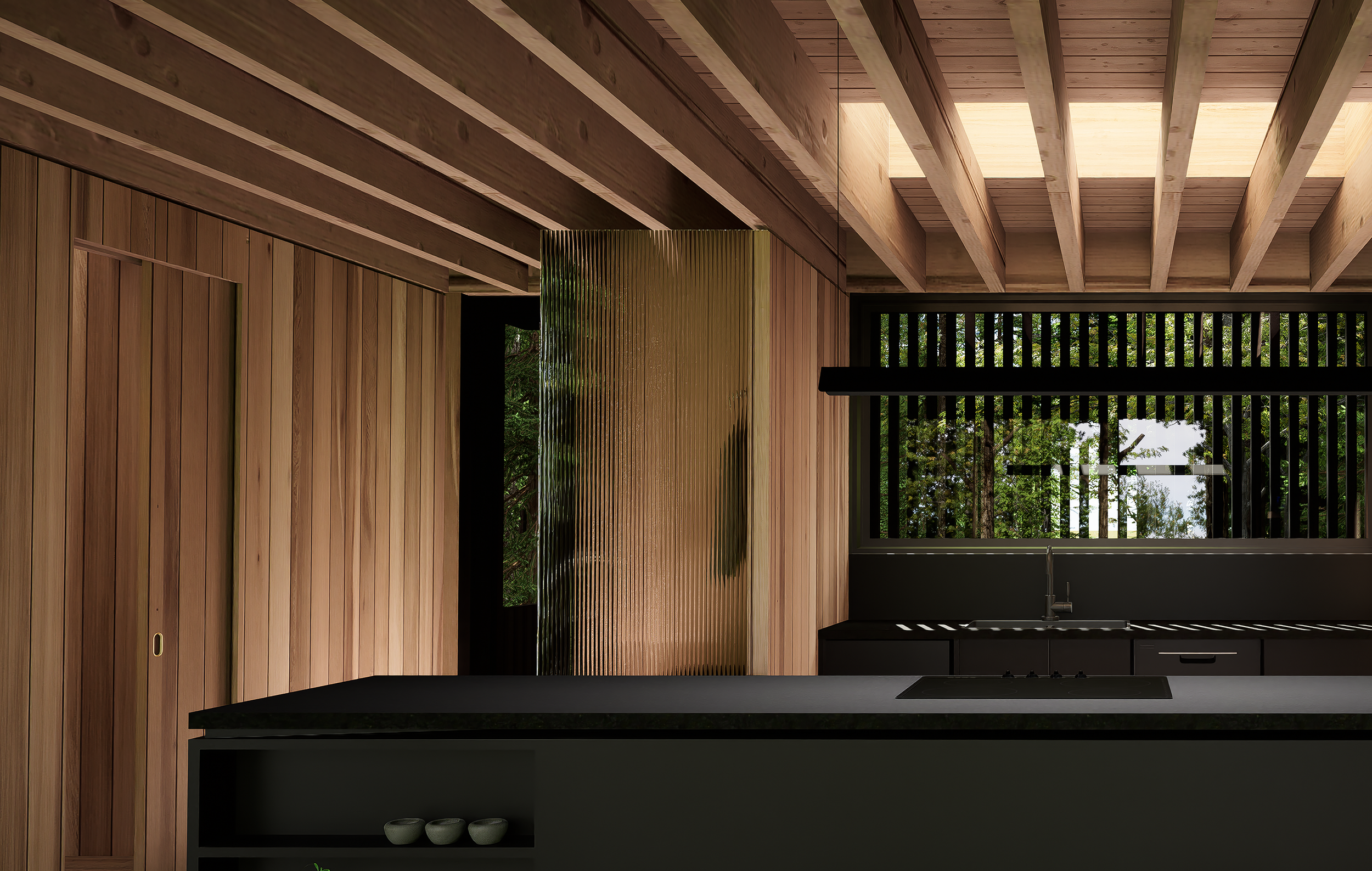 Entièrement construit sans béton, le chalet repose sur des pilotis, épousant la topographie naturelle du terrain afin de réduire au minimum l’impact au sol. Cette configuration a permis de développer une organisation spatiale en deux demi-niveaux (split-level), complétée par un dernier jeu de niveau près de la grande baie vitrée orientée au nord. Cette dernière marche agit comme une assise intégrée, créant un point d’observation privilégié et un effet de vue en plongée sur le terrain en contrebas, renforçant la relation contemplative au paysage.