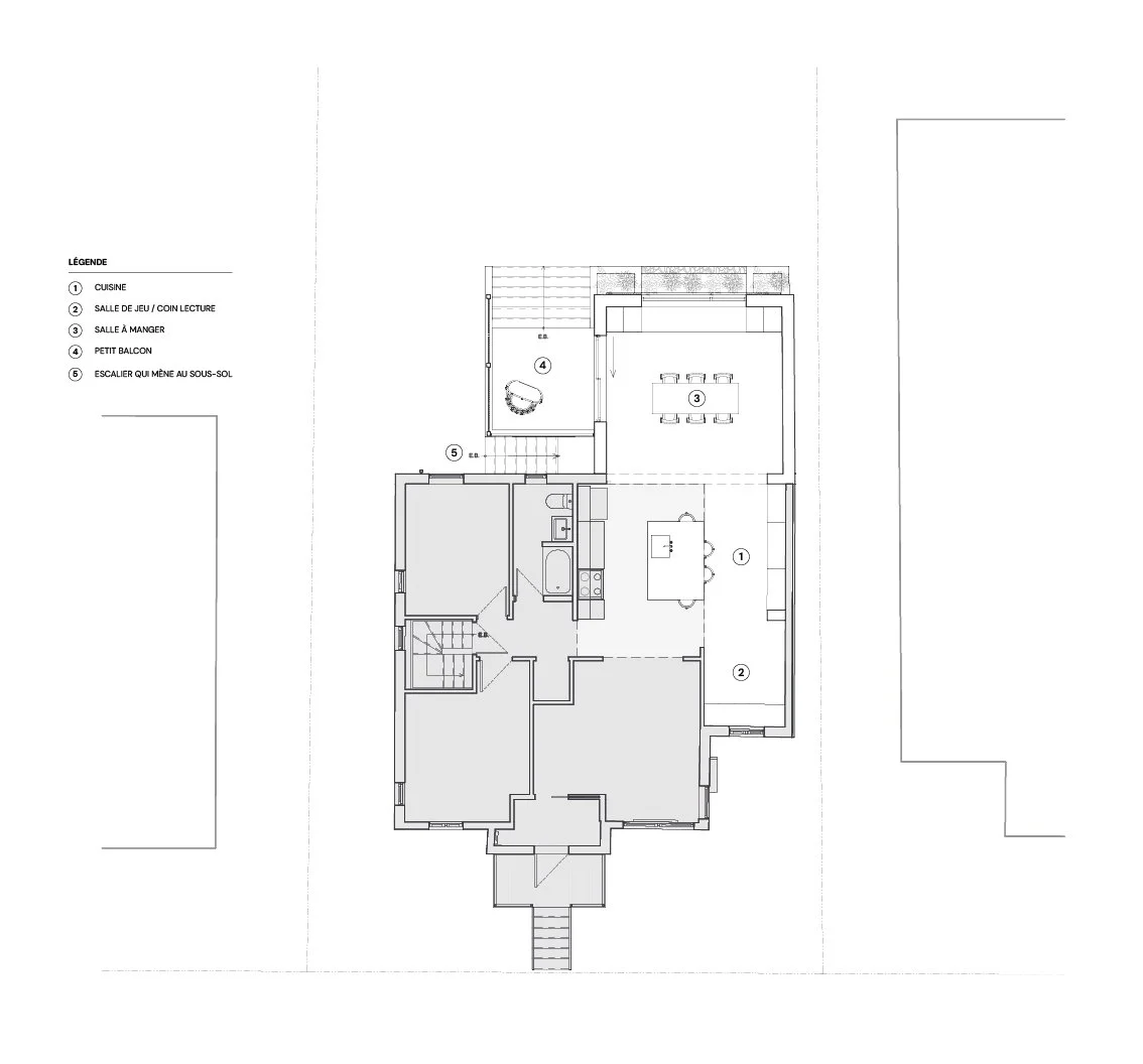 Les clients sont propriétaires d’une maison des Vétérans à Montréal, construite en 1946 dans l’arrondissement de Mercier-Hochelaga-Maisonneuve. Le projet vise à prolonger la maison existante avec un agrandissement compact d’environ 50m² de plancher, implanté dans la marge latérale existante. Cette nouvelle pièce servira de salle à manger et permettra une meilleure relation avec la cour arrière, tout en intégrant un accès secondaire au sous-sol et une terrasse couverte en polycarbonate, favorisant la lumière naturelle et la transparence.