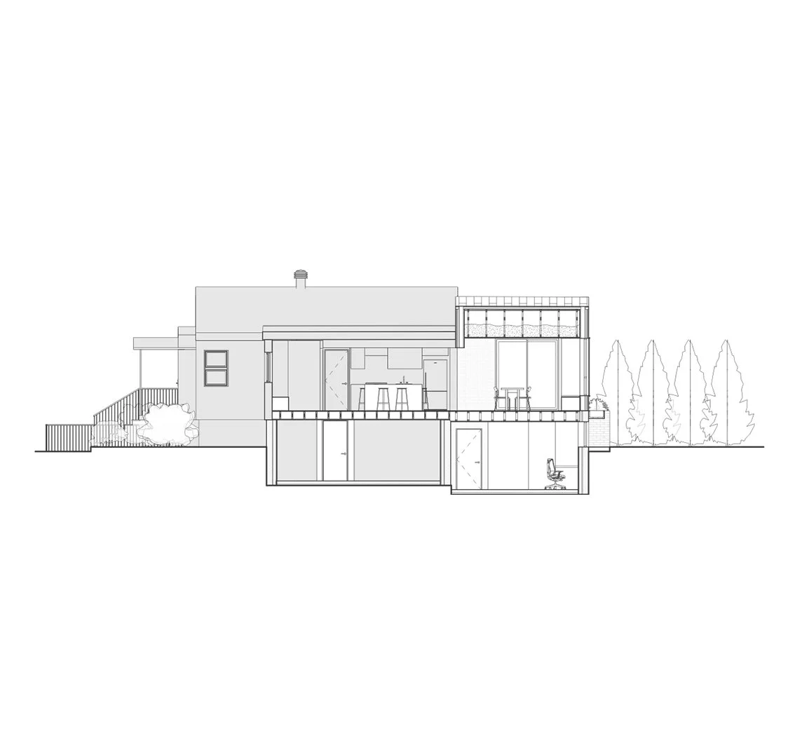À l’intérieur, le projet prévoit l’installation d’un nouvel îlot central et de mobiliers intégrés afin d’optimiser les rangements de la cuisine. L’agrandissement accueillera la nouvelle salle à manger, offrant une vue sur la cour végétalisée où se trouvent de grands arbres matures. Une petite terrasse attenante, équipée d’un écran d’intimité ajouré, filtrera la lumière tout en préservant la confidentialité. L’escalier qui mène au sous-sol est intégré dans la volumétrie globale afin de le dissimuler, tout en venant créer un interstice entre l’existant et le nouveau.