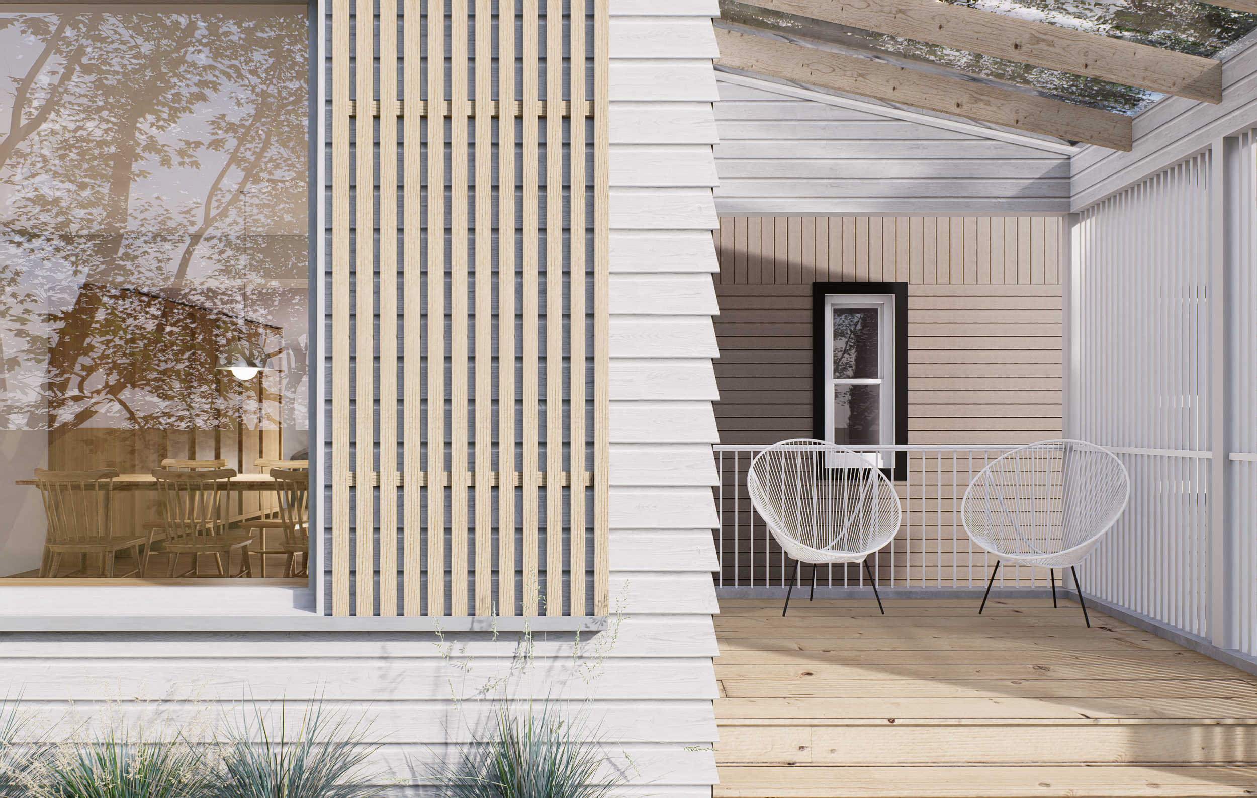 La grande baie vitrée, orientée au sud, sera équipée de volets coulissants en bois permettant de filtrer l’apport solaire à l’intérieur de l’espace de vie. La terrasse, quant à elle, présente une structure apparente et sera protégée par un revêtement de polycarbonate, laissant pénétrer la lumière naturelle.